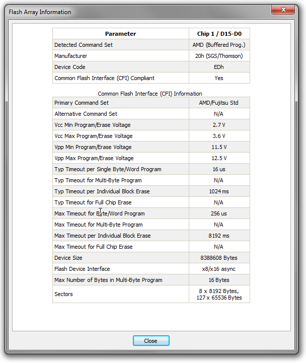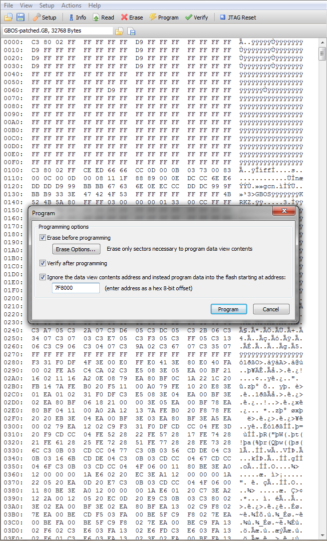 Now that we have successfully read the CFI parameters, we know the devices are all connected properly and we can dump the flash memory (while JTAG boundary scan is a cool way to work with flash chips, it is painfully slow, dumping the whole 8MB took several minutes). With the dumped file, we can see the how the EverDrive software arranges ROMs. The ROM to play is positioned at the bottom of the flash memory, at 0x0000 and the firmware file is 32kB, located at the top of the flash from 0x7F8000 to 0x7FFFFF. Fortunately, this upper 32kB is all we need to overwrite, since writing 8MB would be… painful.