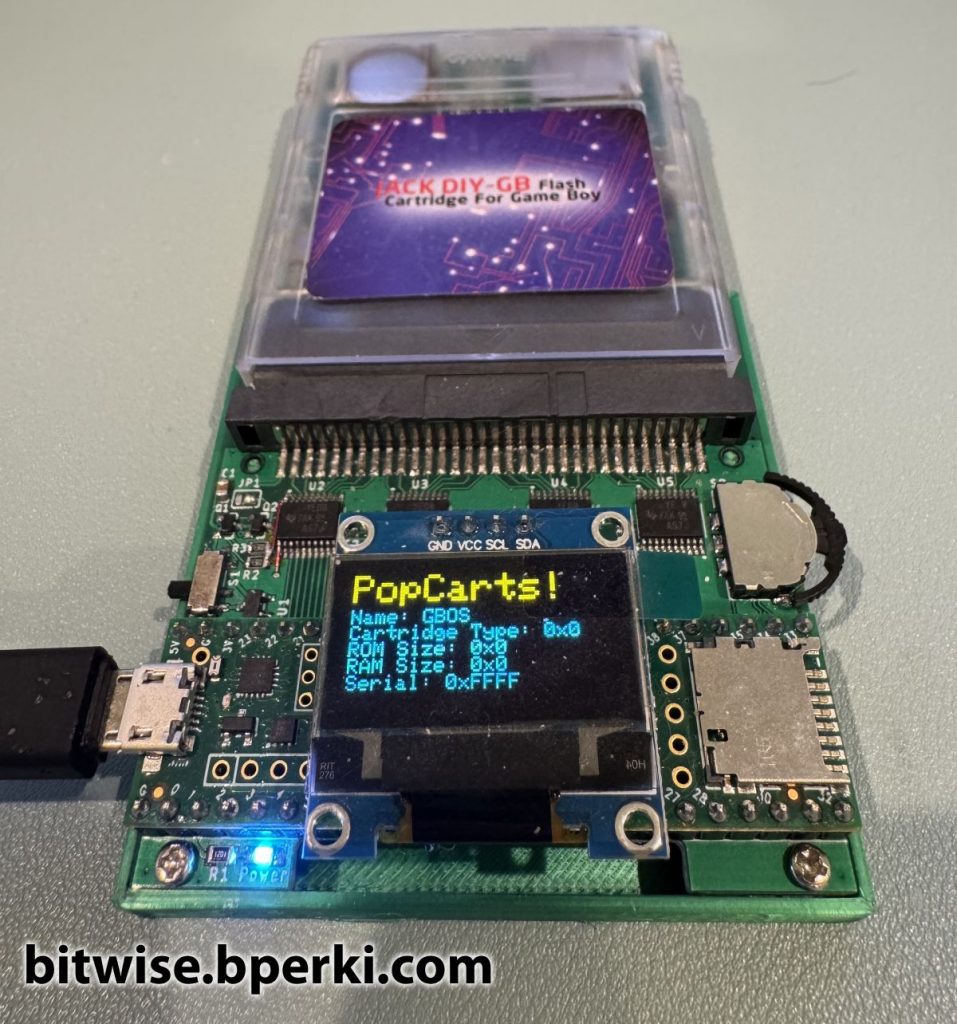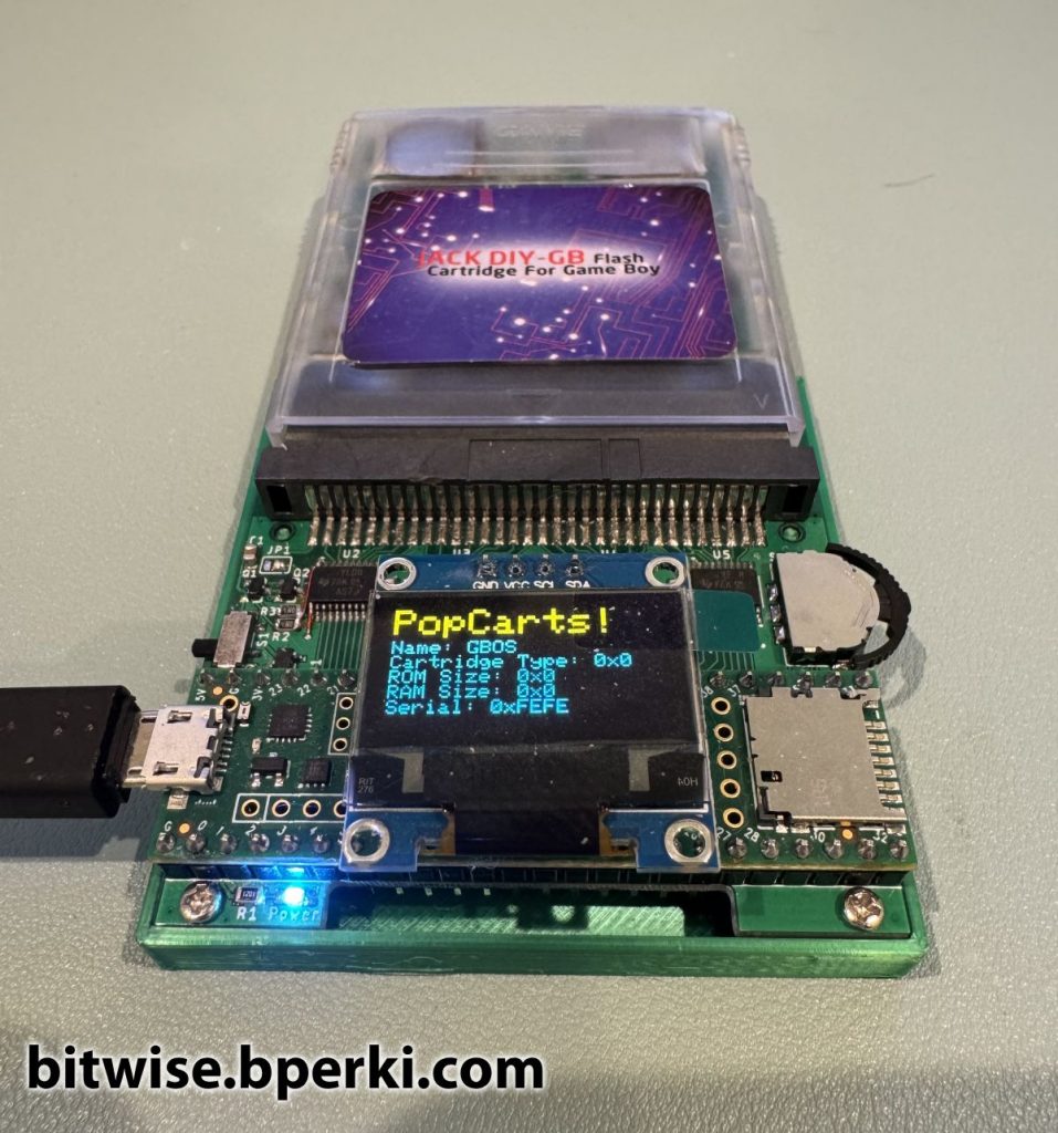 Finally, now that we have the ability to write bytes to the flash, all that’s left to do is erase the top 32kB of the chip and write the new, patched firmware in its place. As we can see, the previously-bricked cartridge is now working just fine, and the firmware is now on the latest, version 4.