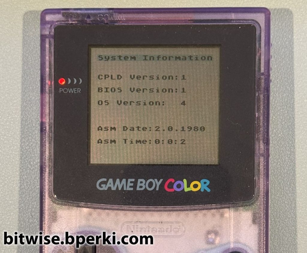 Reading the ROM from flash was trivial – even though it’s located at 0x7F8000, which is outside the address range that could be reached with just 16 address bits on the Game Boy cartridge. When powered up, the CPLD acting as a Memory Bank Controller (MBC) in the EverDrive defaults to setting the higher address bits on flash chip, so reading byte 0x0000 actually maps to reading from 0x7F8000, exactly what we want. I wrote a quick program to display some known values from the Game Boy cartridge – the name of the ROM, the cartridge type, ROM size, RAM size and the all important serial number bits. This gave me a great jumping-off point to start tinkering.